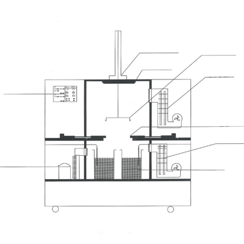 2.3 O revestimento interno da câmara de secagem é fabricado em aço inoxidável 316L. O invólucro externo emprega placa de aço carbono com acabamento revestido por spray. A porta abre para a esquerda, equipada com faixas de vedação resistentes a altas/baixas temperaturas. Uma grande janela de visualização em vidro temperado facilita a observação. O sistema de aquecimento incorpora tubos internos de aquecimento em aço inoxidável. O design do duto de ar apresenta descarga de ar pelo lado direito, com retorno de ar pelo lado esquerdo. Um motor de ventilador importado resistente a altas temperaturas garante convecção forçada com circulação de difusão vertical, eliminando zonas mortas e alcançando distribuição uniforme de temperatura em toda a câmara. Um termômetro de resistência de platina PT100 de alta precisão Classe A fornece detecção sensível de temperatura para precisão de controle superior. O monitoramento da umidade em tempo real está integrado (como a secagem com ar quente elimina a necessidade de equipamento de desumidificação separado, a umidade da câmara permanece ≤50%).